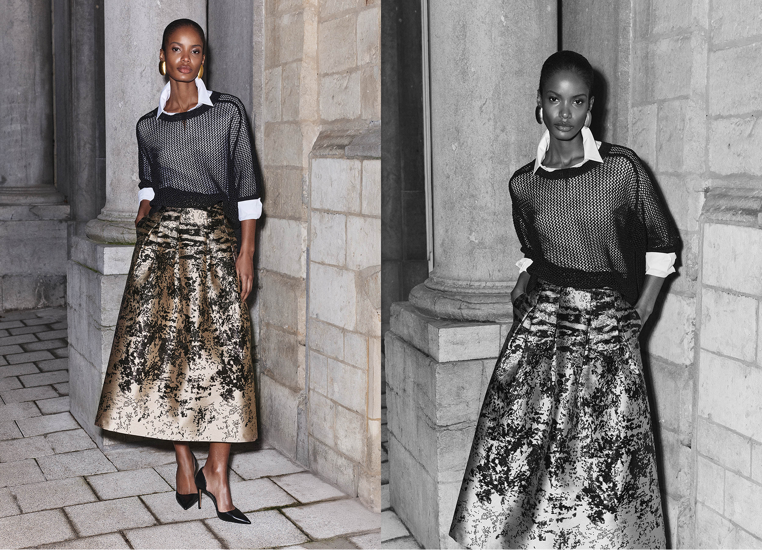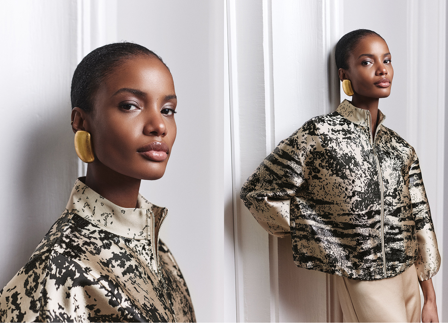 Texture is what gives this collection its depth. Open-knit jumpers are layered over a crisp white shirt, creating a look that appears relaxed but never compromises on sophistication. Every detail is carefully considered, every combination feels natural. Jacquard serves as the visual cornerstone for ICONIC SS26. Black raffia woven into graphic patterns catches the light with a subtle shine. The skirt and bomber jacket add character and presence, ideal for those looking for a summer party look with personality.