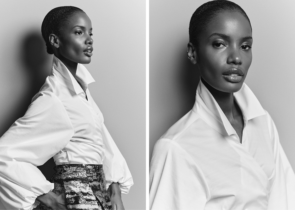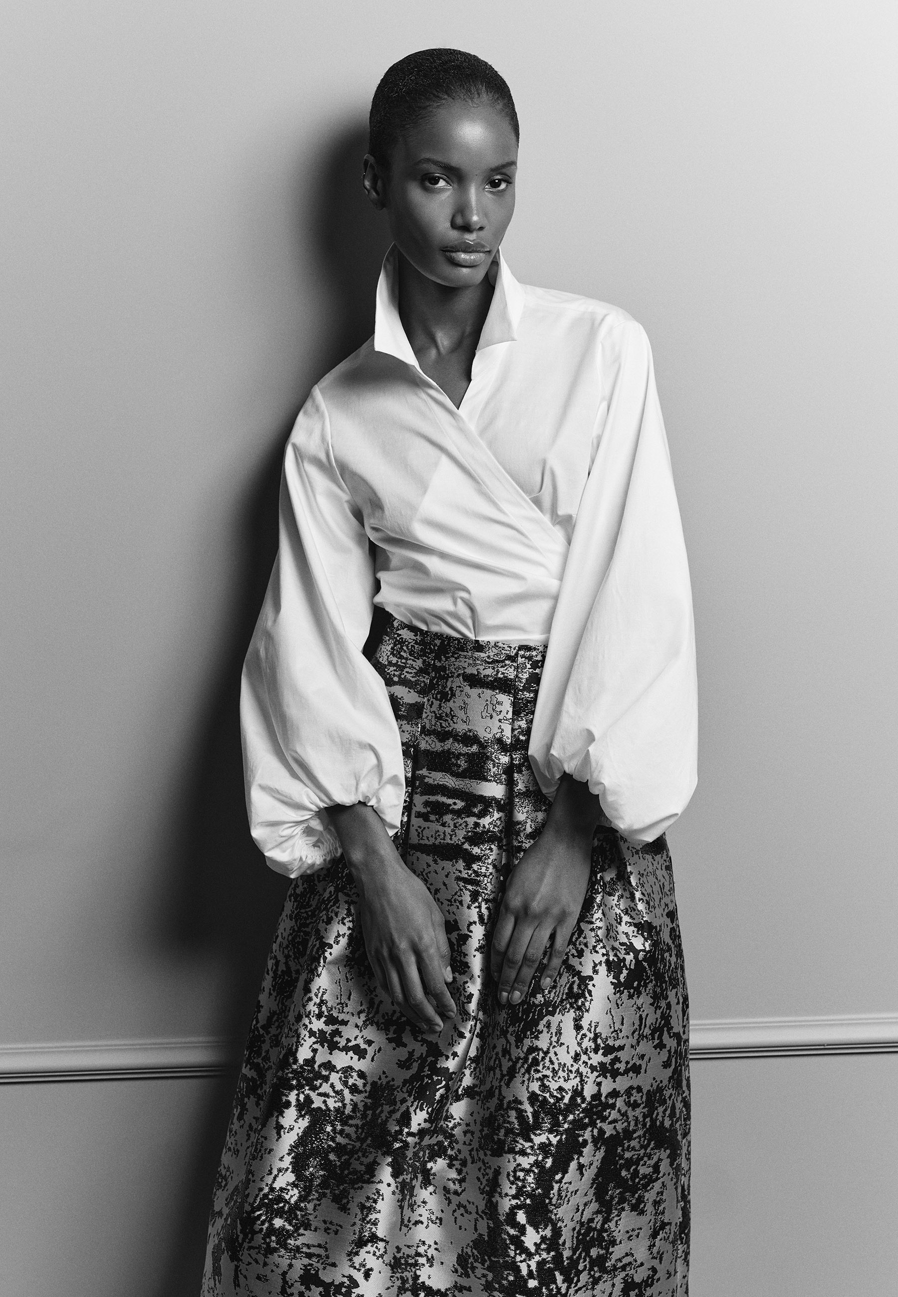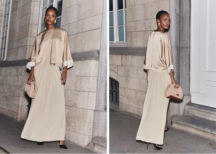 Transparency serves as a key starting point in this collection. Not as a statement, but as a nuance. Airy muslin fabric moves around the body in double layers, soft and controlled at the same time. Graphic oversized tops reveal a silk underlayer that subtly shows through, elegantly adding a sense of intrigue to the silhouette.