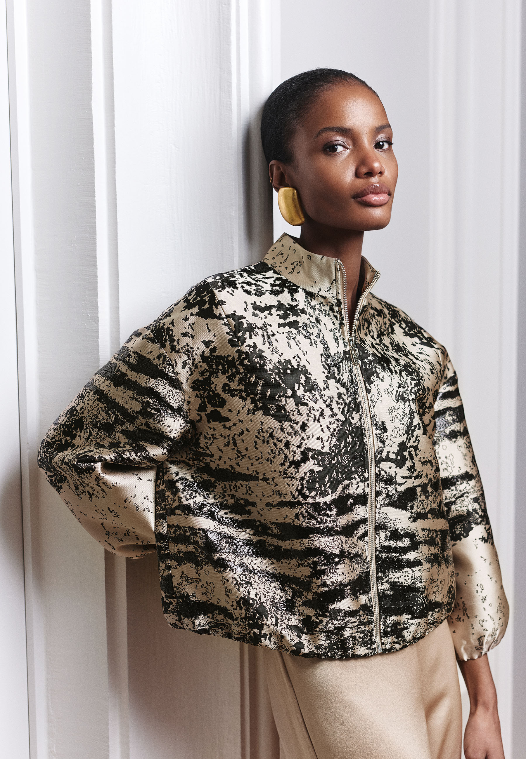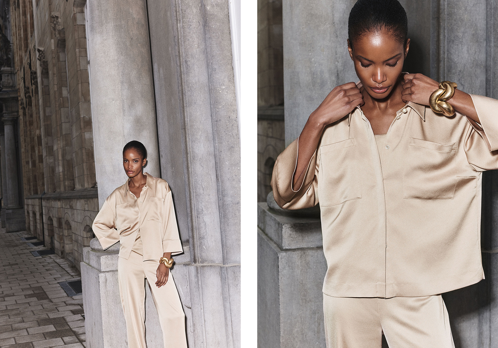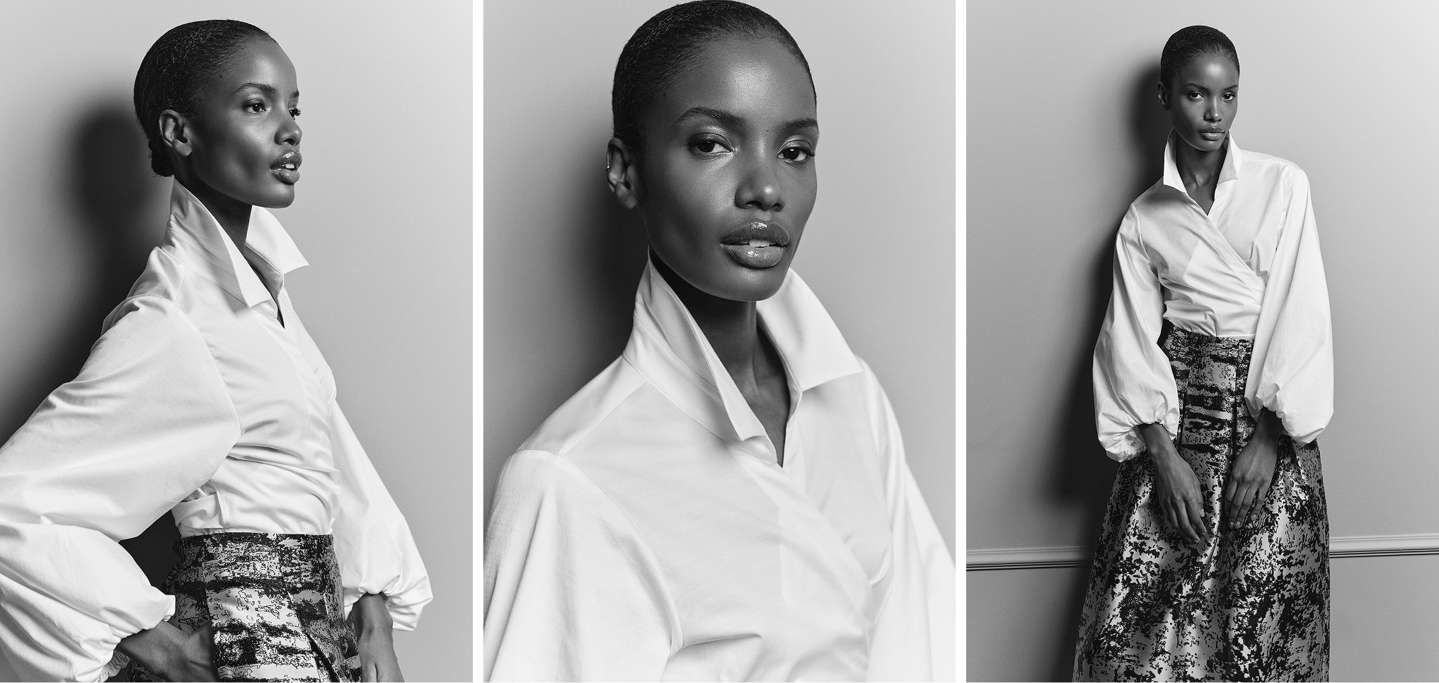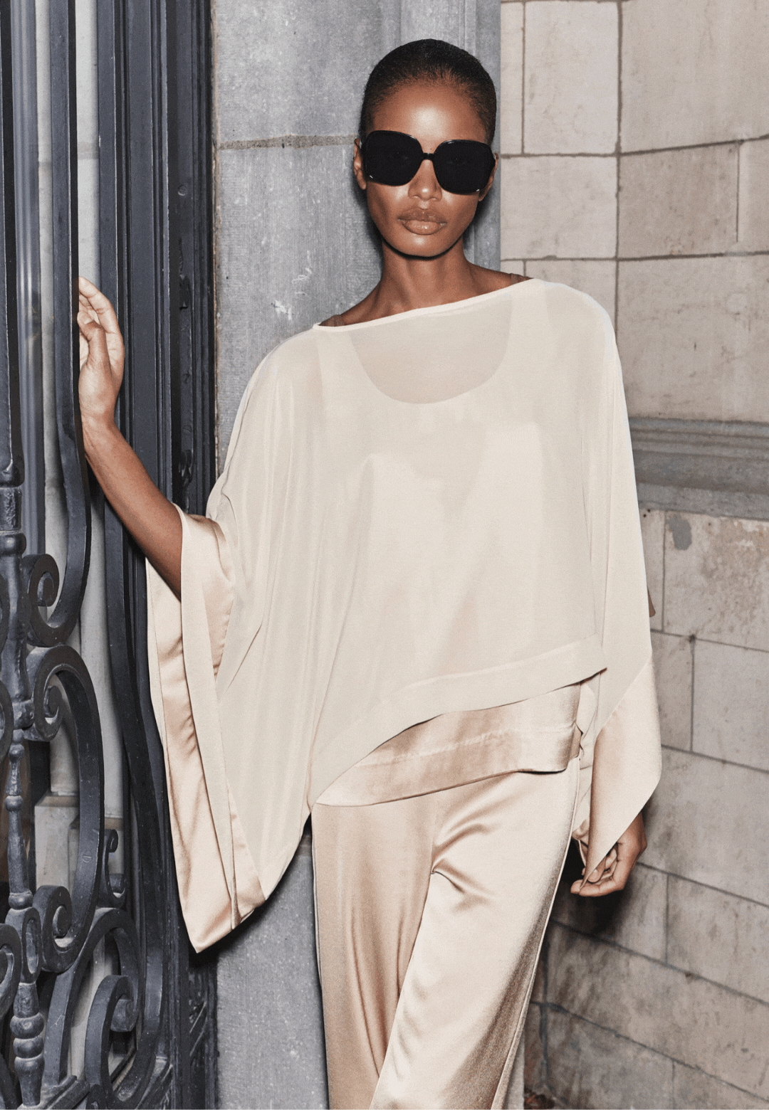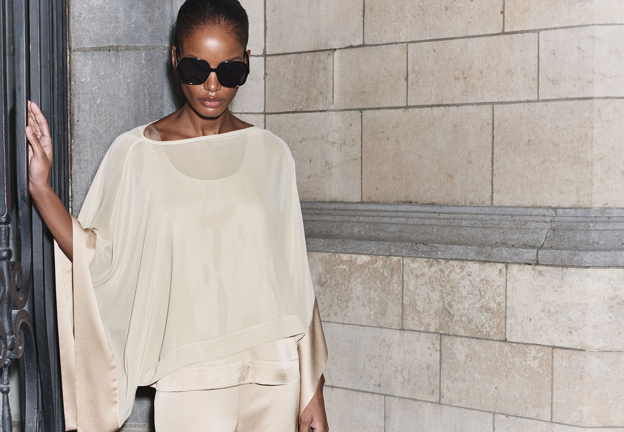 Luchtige mousseline beweegt rond het lichaam in dubbele lagen, zacht en gecontroleerd tegelijk. Grafische oversized tops onthullen een zijden onderlaag die subtiel doorschemert, en zo een elegante spanning toevoegt aan het silhouet.