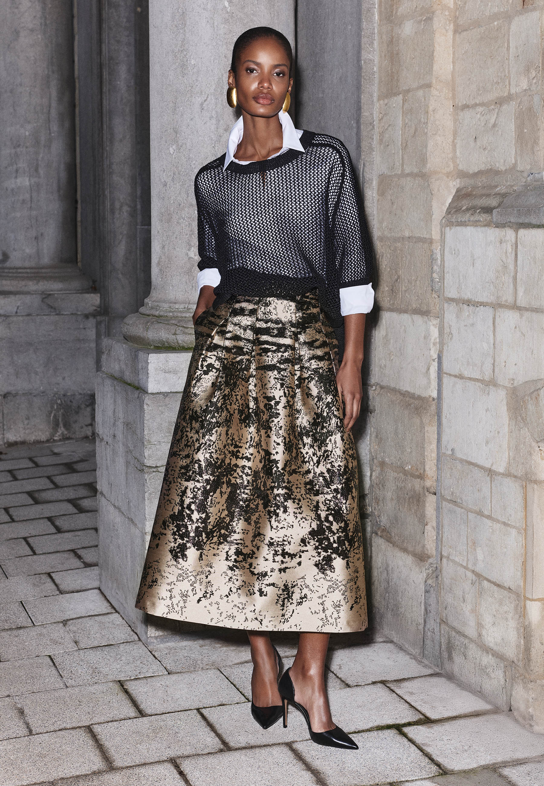 Textuur geeft de collectie haar diepte. Open gebreide tricots worden gelaagd over een crisp wit hemd, waardoor een look ontstaat die ontspannen oogt maar verfijnd blijft. Elk detail is doordacht, elke combinatie voelt natuurlijk. Jacquard vormt het visuele anker van Iconic SS26. Zwarte raffia, geweven in grafische patronen, vangt het licht met een subtiele glans. De rok en bomber jacket brengen karakter en présence, ideaal voor wie een zomerse feestlook zoekt met karakter.