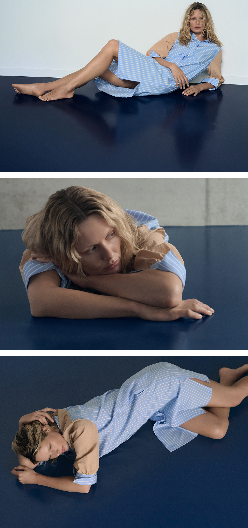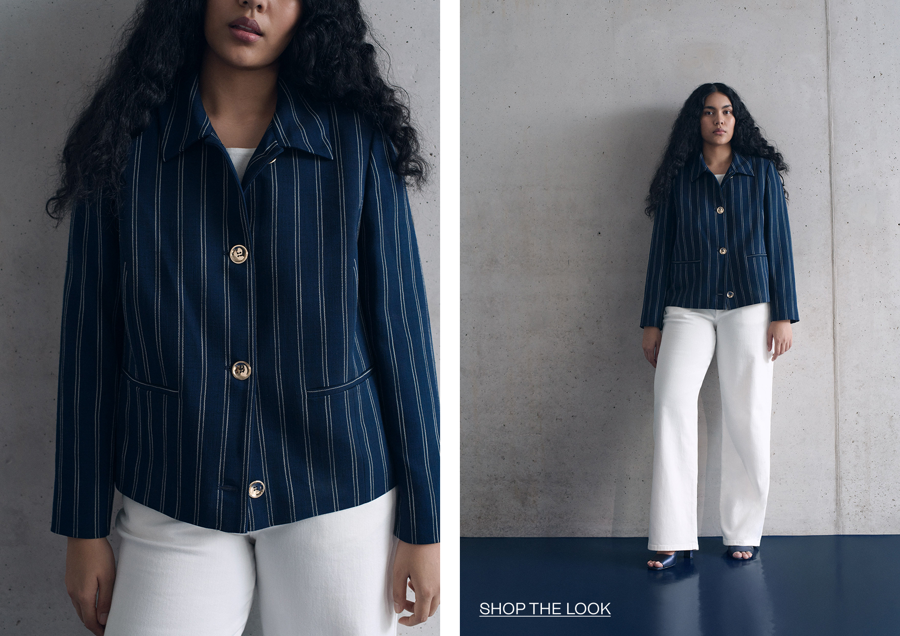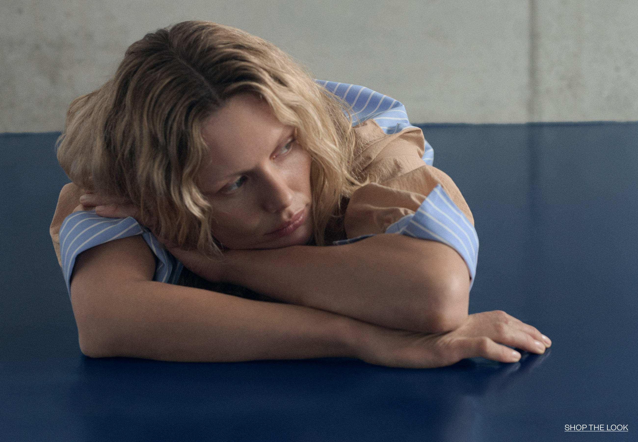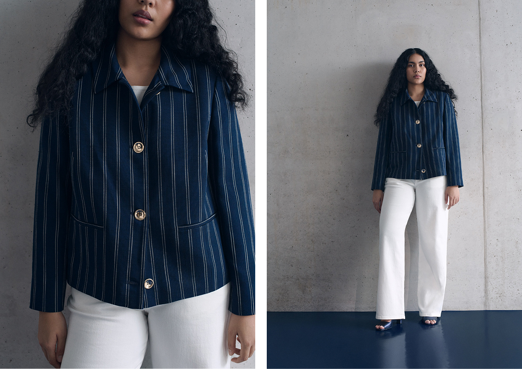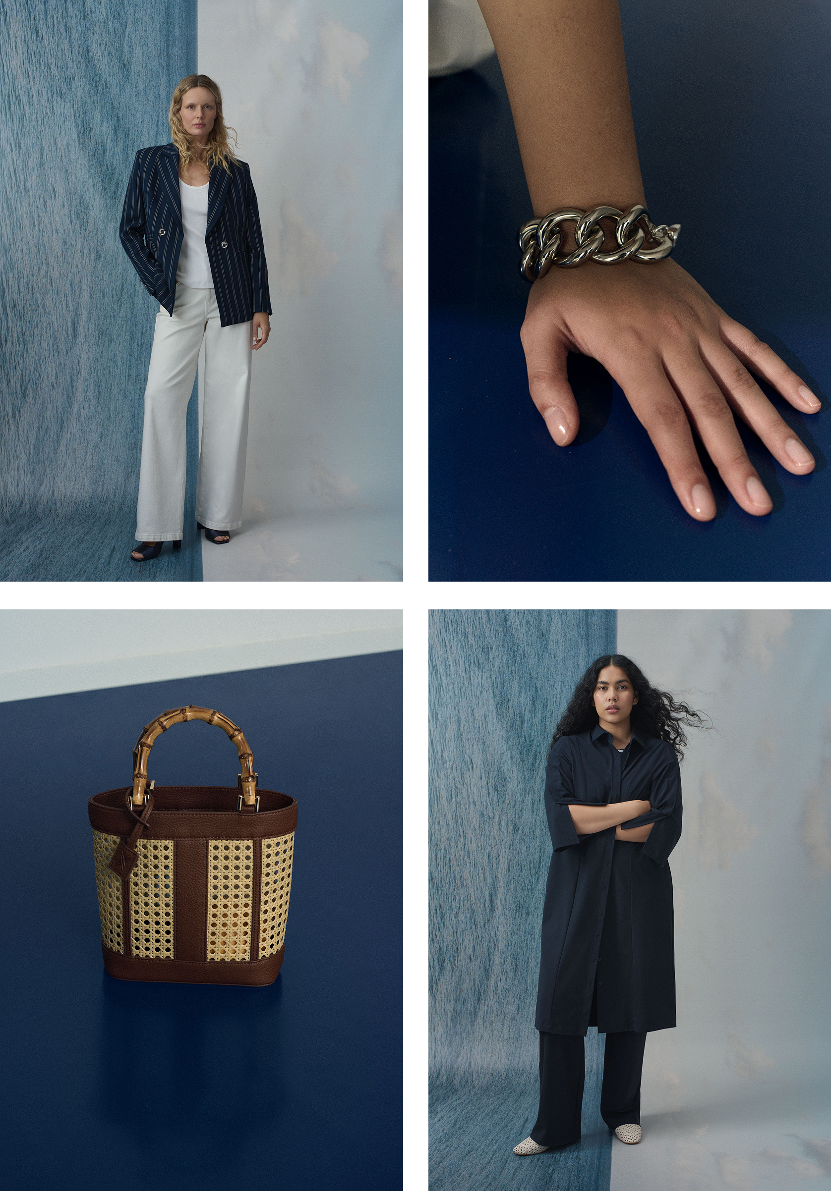 helder blauw, diep navy, warm beige en puur wit. Streepjes — tijdloos en zelfverzekerd — verschijnen in jurken, hemden en outerwear, afgewerkt met verfijnde, goudkleurige knopen die doen denken aan de klassieke nautische esthetiek.