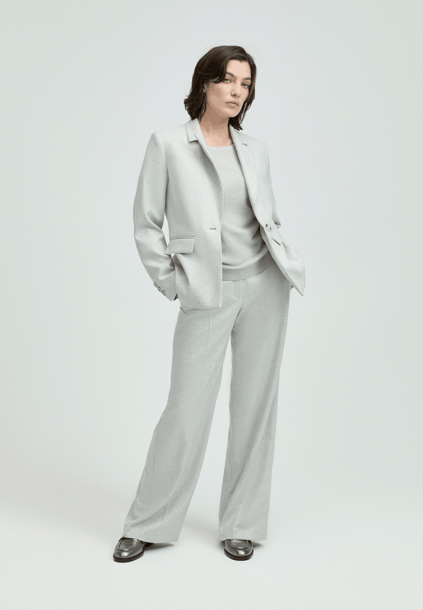 Elegantie krijgt een moderne twist met een pak dat subtiel schittert. Kleine lovertjes zorgen voor een sprankeling die elke beweging volgt, ideaal voor feestelijke momenten en chique events.